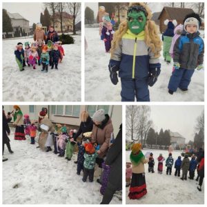 Katarzyna Parszuta zachęcała wspólnotę przedszkola do zabawy i wyścigów, w których ciągle rywalizowali Konopiasty i Słoninowy. Zwycięstwo wypadlo dla Konopiastego. W toku zabawy dzieci recytowały wiersze. Ostatnim oznakiem pożegnania z Panią Zimą było spalenie Marzanny. Następnie dzieci z apetytem jadły pyszne bliny.