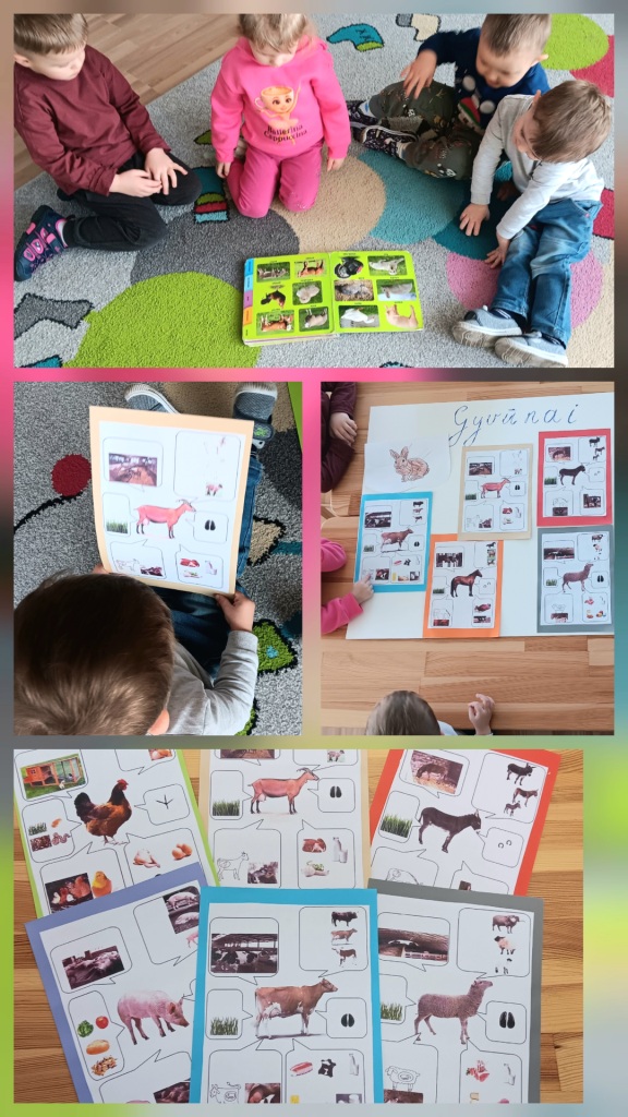 Wiele rozmawialiśmy z dziećmi o zwierzętach i uczyliśmy się ich nazw w języku litewskim. Każde dziecko z zainteresowaniem powtarzało nowe słowa i wskazywało zwierzęta na obrazkach. Przedszkolaki z zadowoleniem wykonały plakat „Gyvūnai”.
