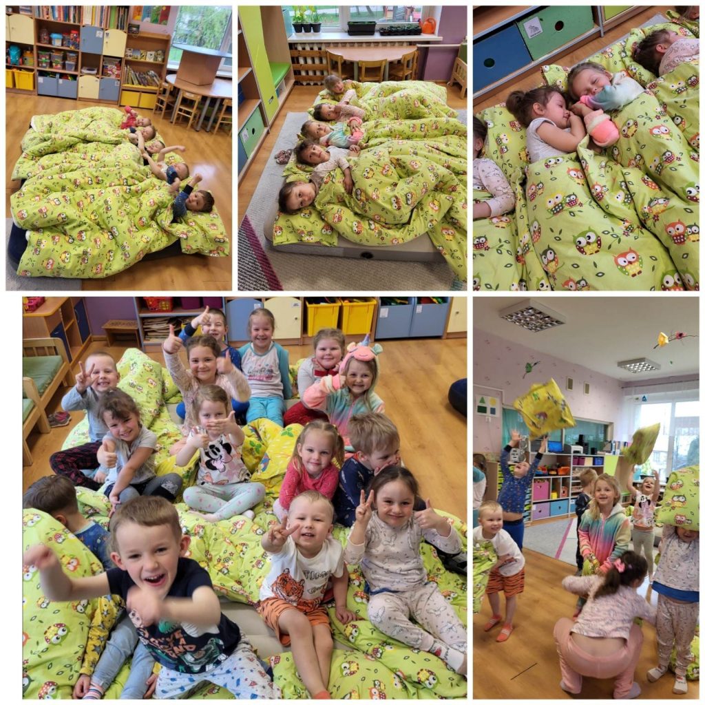 26 kwietnia w grupie Krasnoludki odbyło się ,,Piżama party”. Dzieci długo czekały na ten dzień i wreszcie się doczekały. Chociaż piżama kojarzy się z relaksem i odpoczynkiem, ale imprezka była wspaniała. Oprócz bitwy na poduszki, pokazu ,,piżamowej mody”, było jeszcze wiele innych zabaw. Chwila wytchnienia nadeszła wraz z pojawieniem się pysznych smakołyków. Dzieci były zmęczone, ale bardzo zadowolone. Zakończyliśmy imprezę oglądaniem filmu w piżamkach w przysmakiem pysznego popcornu. Dzień był udany, pełen pozytywnych emocji i wrażeń.