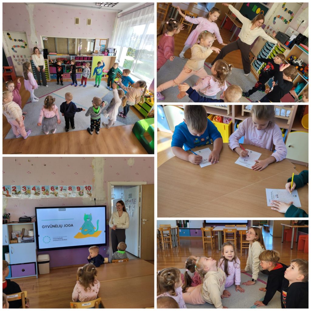 Didžiausią džiaugsmą ugdytiniams sukėlė praktinė veikla – „gyvūnėlių joga“. Jos metu vaikai, atlikdami smagias užduotis, ne tik pasitikrino įgytas žinias, bet ir lavino savo judesius, lankstumą bei kūno pajautimą.