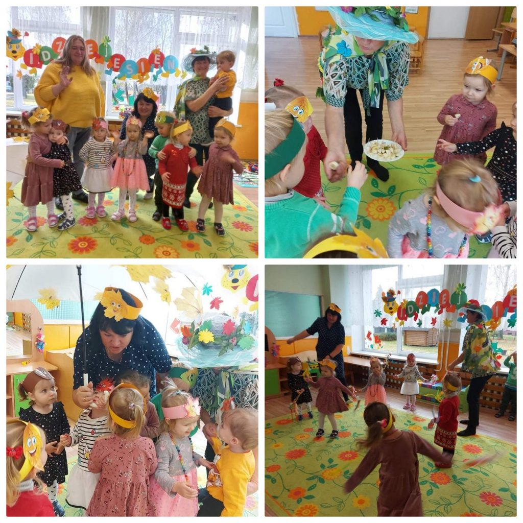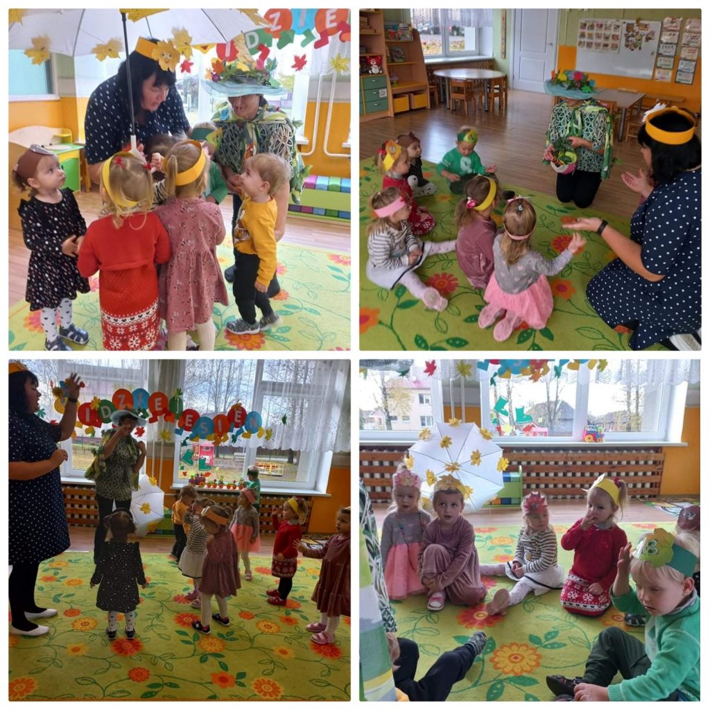 W słoneczny, piękny październikowy dzień, dzieci z grupy „Pszczółki” wzięły udział w święcie „Idzie Jesień”. Wśród jesiennych parasoli i radosnych przedszkolaków pojawiła się postać Pani Jesieni. Kolorowy płaszcz i ogromny kapelusz nie przeszkodził dzieciom rozpoznać w Pani Jesieni panią Marię, która przywitała wszystkie dzieci. Organizowane były zabawy o tematyce jesiennej, poprzez które dzieci przyswoiły sobie wiadomości o rozpoczynającej się właśnie porze roku. Maluszki z listkami w ręku wirowały wkoło przy piosence „Kolorowe listki”. Dzieci chętnie się bawiły z Panią Jesień, tańczyły, odgadywały zagadki, a także kosztowały różne owoce.
