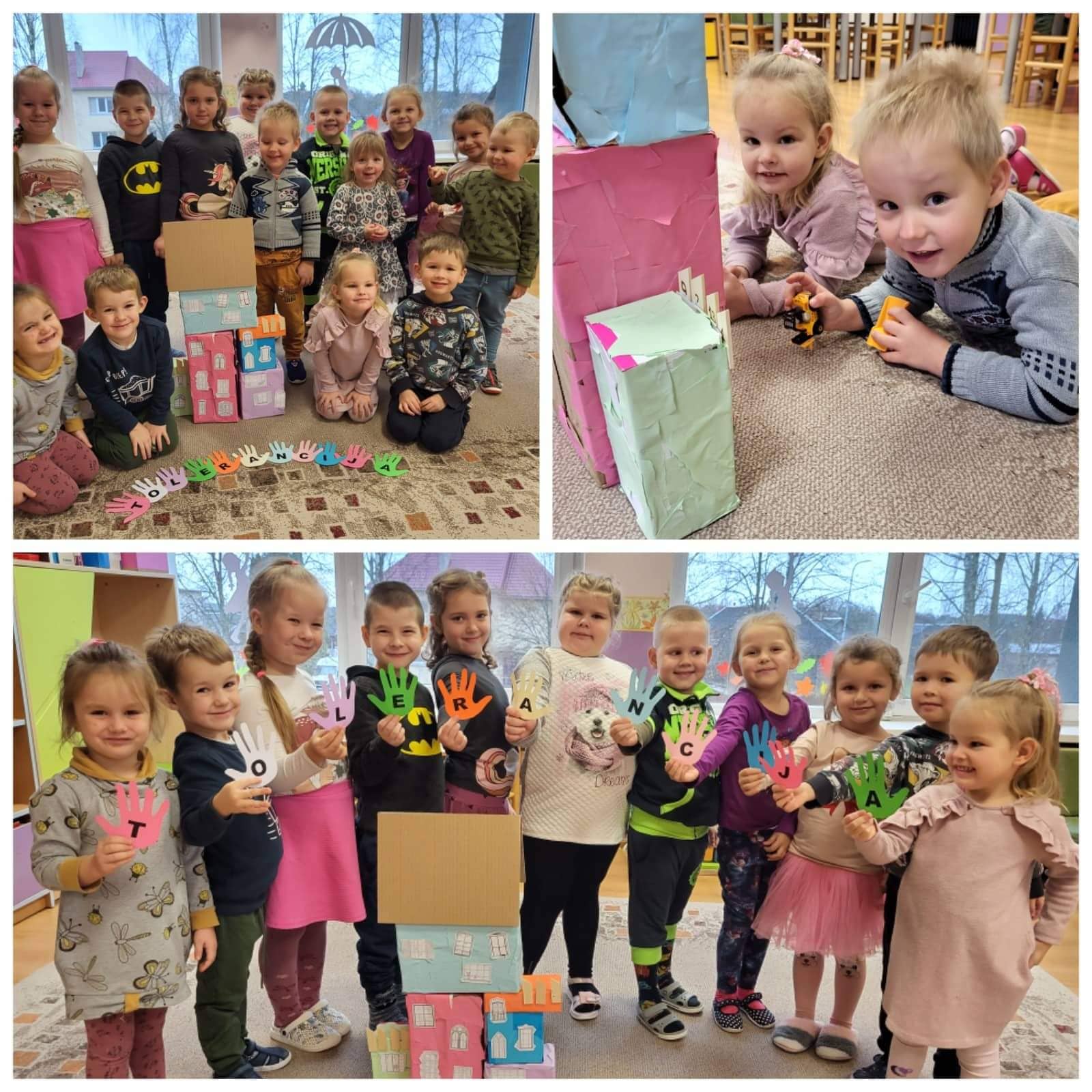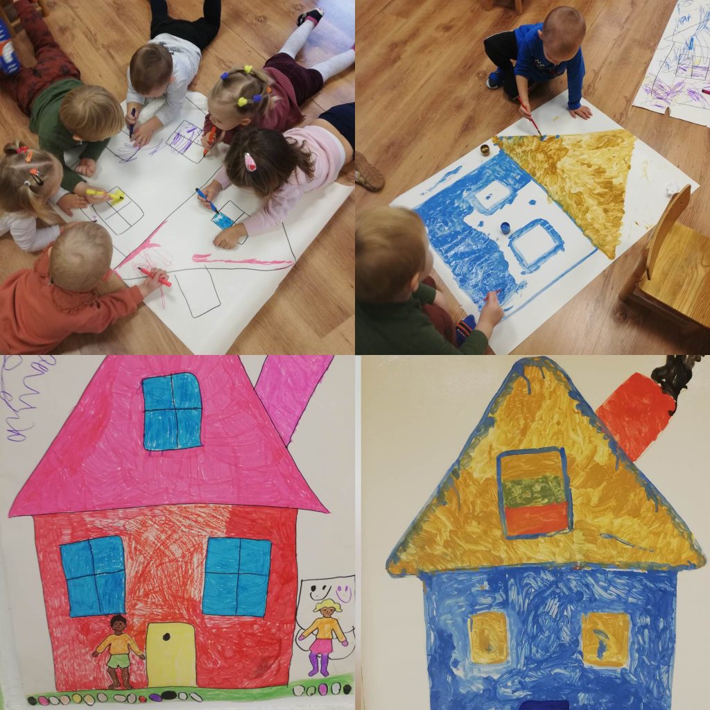 Naudojant įvairias priemones, ugdytiniai piešė namus, daro aplikacijas, kūrė namų maketus, kurie susiję su Tolerancijos namo idėja.