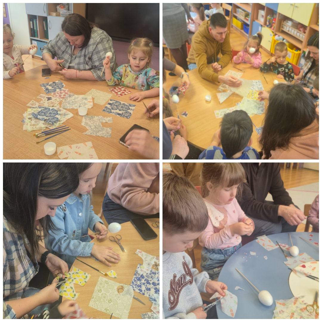 Velykinių margučių dekoravimas dekupažo technika – tai meninė veikla, kurios metu, naudojant popierių ar servetėles, dekoruojami įvairūs paviršiai: mediniai, keraminiai ar stikliniai. Edukacijos metu vaikai susipažino su dekupažo technika, patys išsikarpė norimus paveikslėlius bei raštus ir juos kruopščiai klijavo ant paruošto putplasčio kiaušinio.