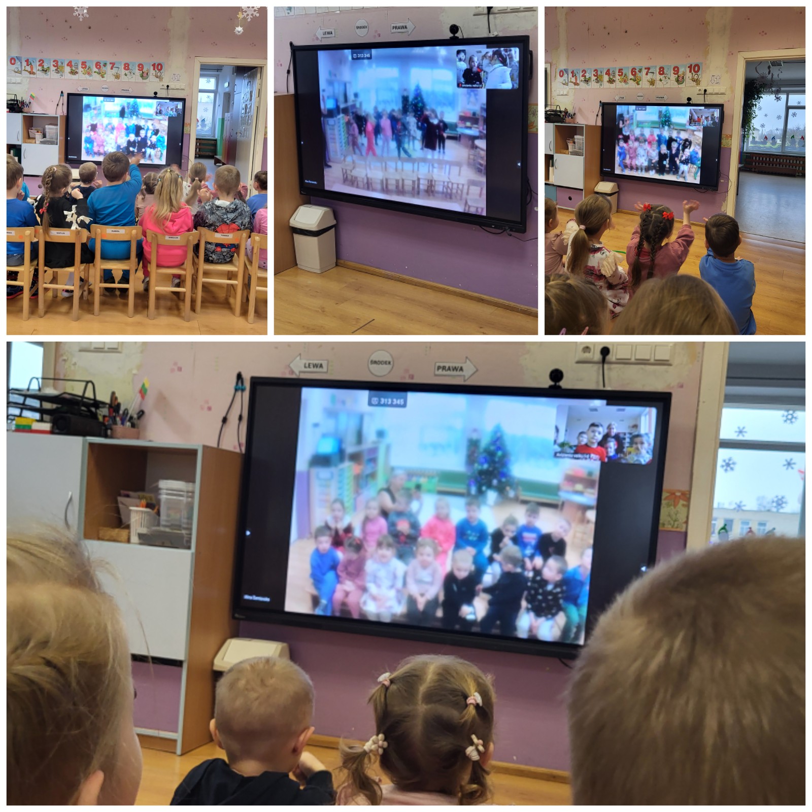 Dzieci wzajemnie się poznały, wspólnie odgadywały zagadki oraz tańczyły świąteczne tańce. Był to pełen wrażeń, radosny i świąteczny czas. Mamy nadzieję, że kiedyś uda nam się spotkać na żywo. Bardzo cieszymy się, że mieliśmy możliwość poznania dzieci z innego przedszkola.